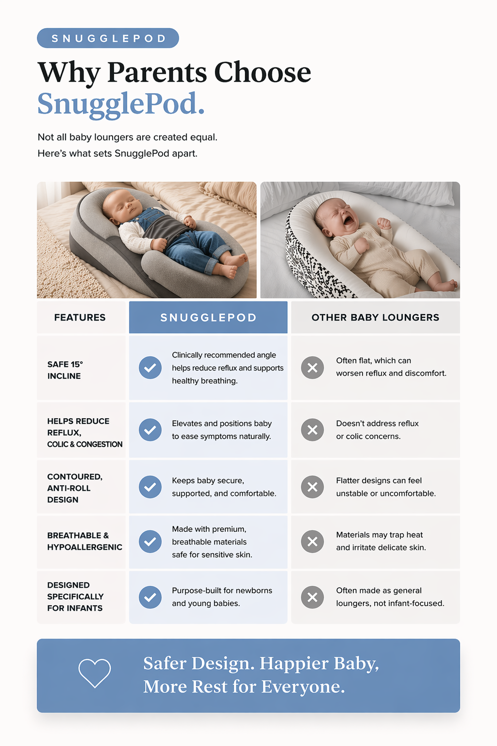 SnugglePod™ stands apart with its unique blend of ergonomic design, luxurious comfort, and unwavering safety features. It's not just a bed; it's a sleep sanctuary designed to nurture the most serene slumbers for your little one, fostering happy, well-rested babies and parents.